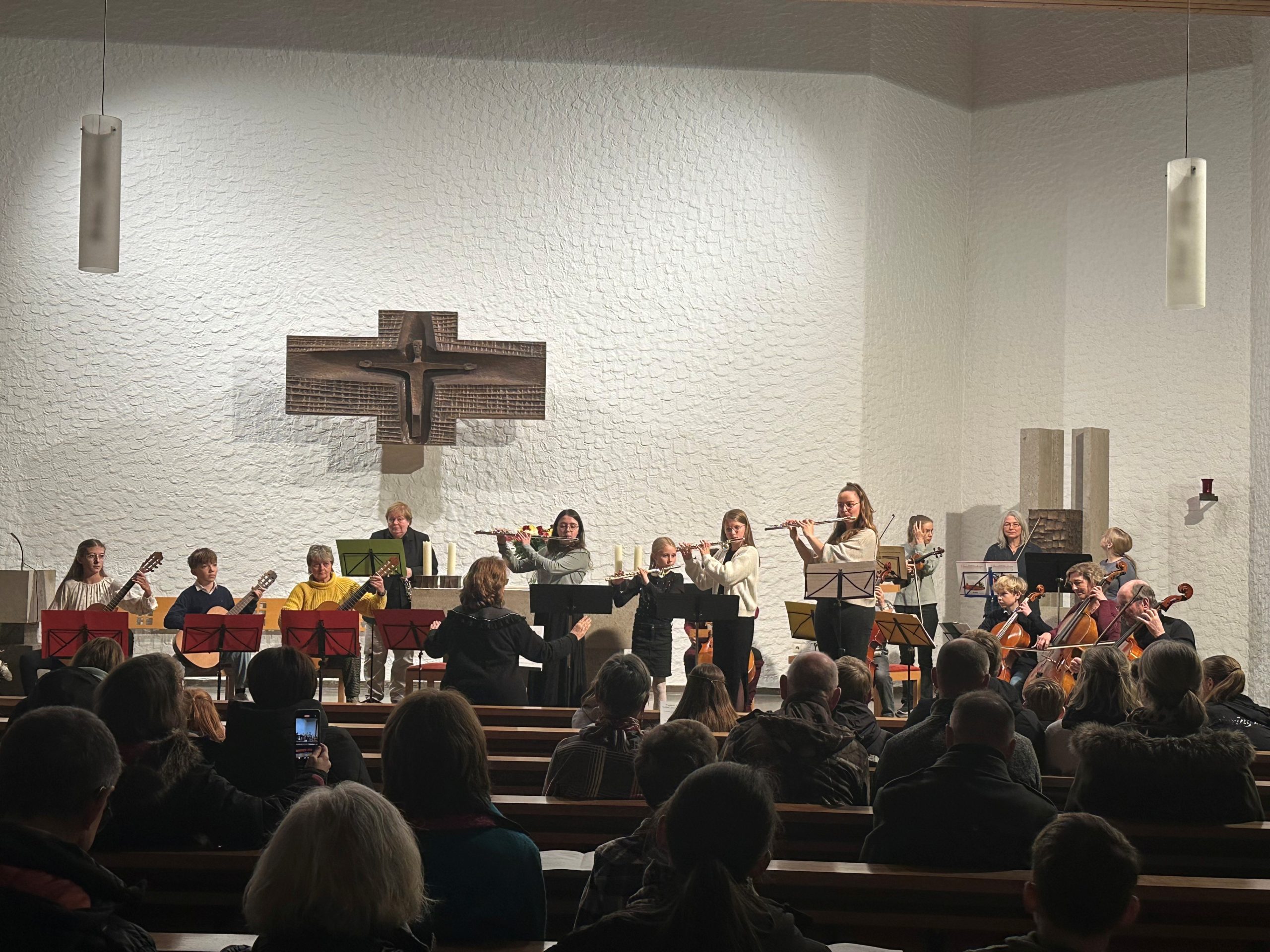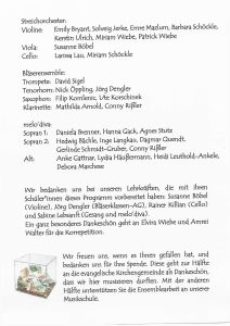 Unser Höhepunkt des Jahres fand in der katholischen Kirche statt. Es musizierten zahlreiche Ensembles, kammermusikalische Gruppierungen sowie unser Frauen-Vocalensemble melo’diva. Zu hören war das Ensemble der Bläserklassen-AG unter der Leitung von Jörg Dengler, das Gitarrenensemble unter der Leitung von Steffi Häußermann und das Streicherensemble unter der Leitung von Susanne Böbel. Die kammermusikalischen Beiträge reichten von „Ein Männlein steht im Walde“ (Blockflöte/Klavier) über „Katango“ (Gitarre/Cello), 1. Sonate aus Pepusch’s opus 1 (Blockflöte, Cello, Klavier), „Latin“ und „Madrigal“ (Querflöte/Klavier), „Hope, told a flattering tale“ (Violine/Klavier) bis hin zu Bartholdy’s Herbst- und Abendlied (Gesangsduo/Klavier).